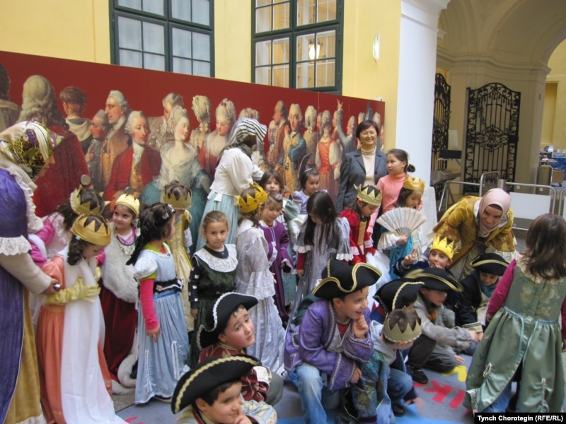 Шөнбрунндагы балдар музейине келген түрк айымдар музейдеги кийимдерди балдары менен чогуу кийип, сүрөткө түшүүдө. 2010-ж., 23-октябр. TCh.