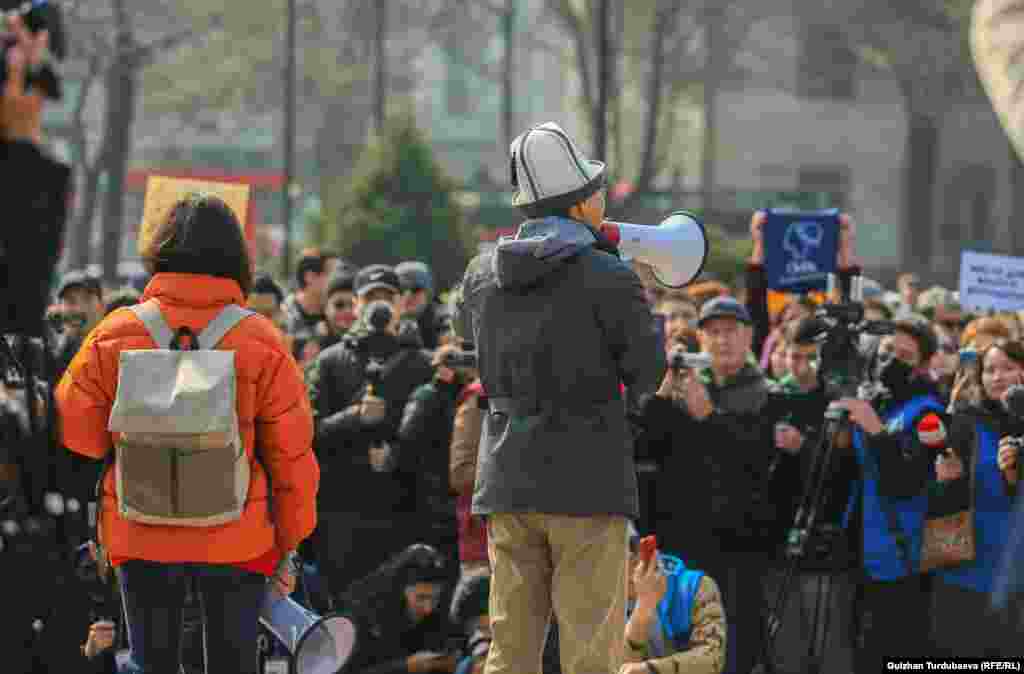 Уркуя Салиева атындагы «Революция каармандарынын» эстелигинин жанында аялдардын укуктарын коргоо акциясы өтүп, анда «Зордук-зомбулукка каршы!», «Эки жүздүүлүккө каршы!» деген өңдүү ураандар чакырылды. Акция саат 12:00до башталды.