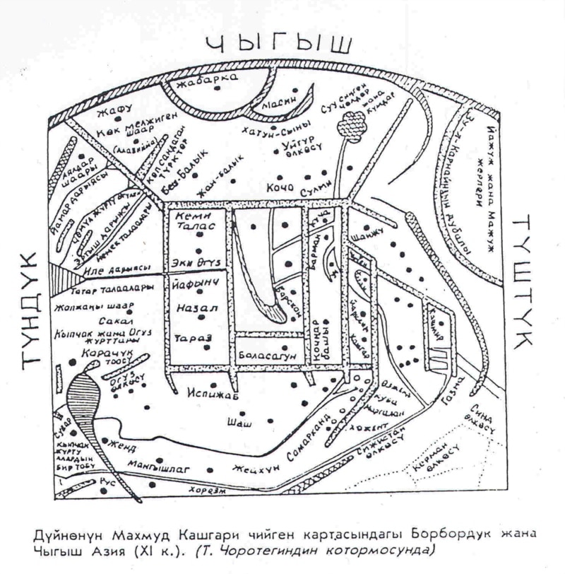 Махмуд Кашгаринин "Дивану лугати т-түрк" эмгегиндеги дүйнө картасынын Борбордук жана Чыгыш Азия бөлүгүнүн кыргызча котормосу. Т.Чоротегин. 1997-жыл.