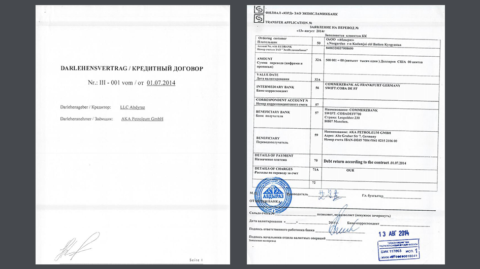 Саймаити журналисттерге анын Кыргызстанда катталган “Абдыраз” фирмасы Абдукадырдын үй бүлөсүнүн Германиядагы “АКА Петролеум” деп аталган компанияларына 30 миллион доллар карыз бергени жөнүндө жалган келишимди көрсөткөн. Германиянын мыйзамдарына ылайык түзүлүп, 1-июль 2014-жыл деп белгиленген келишимде “АКА Петролеумдун” мөөрү, Хабибула Абдукадырдын Мюнхендеги өкүлүнүн колунукуна окшош кол коюлган.