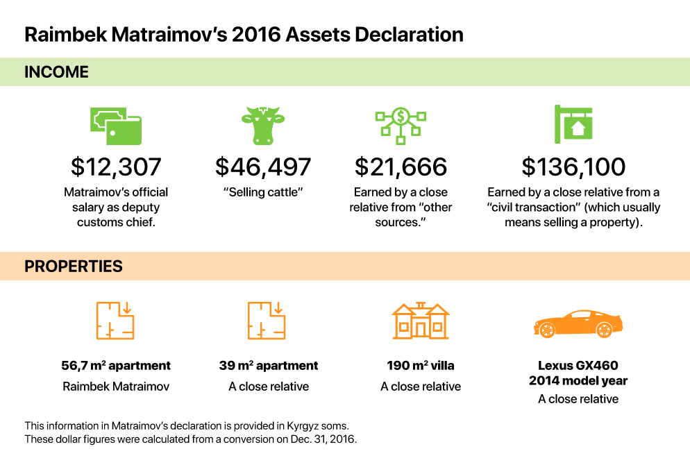 Матраимовдун 2016-жылкы декларациясы анын үй-бүлөсү 12,5 миллион доллар инвестицияны кантип салганын түшүндүрө албайт. Чоңойтуш үчүн бул жерди басыңыз.