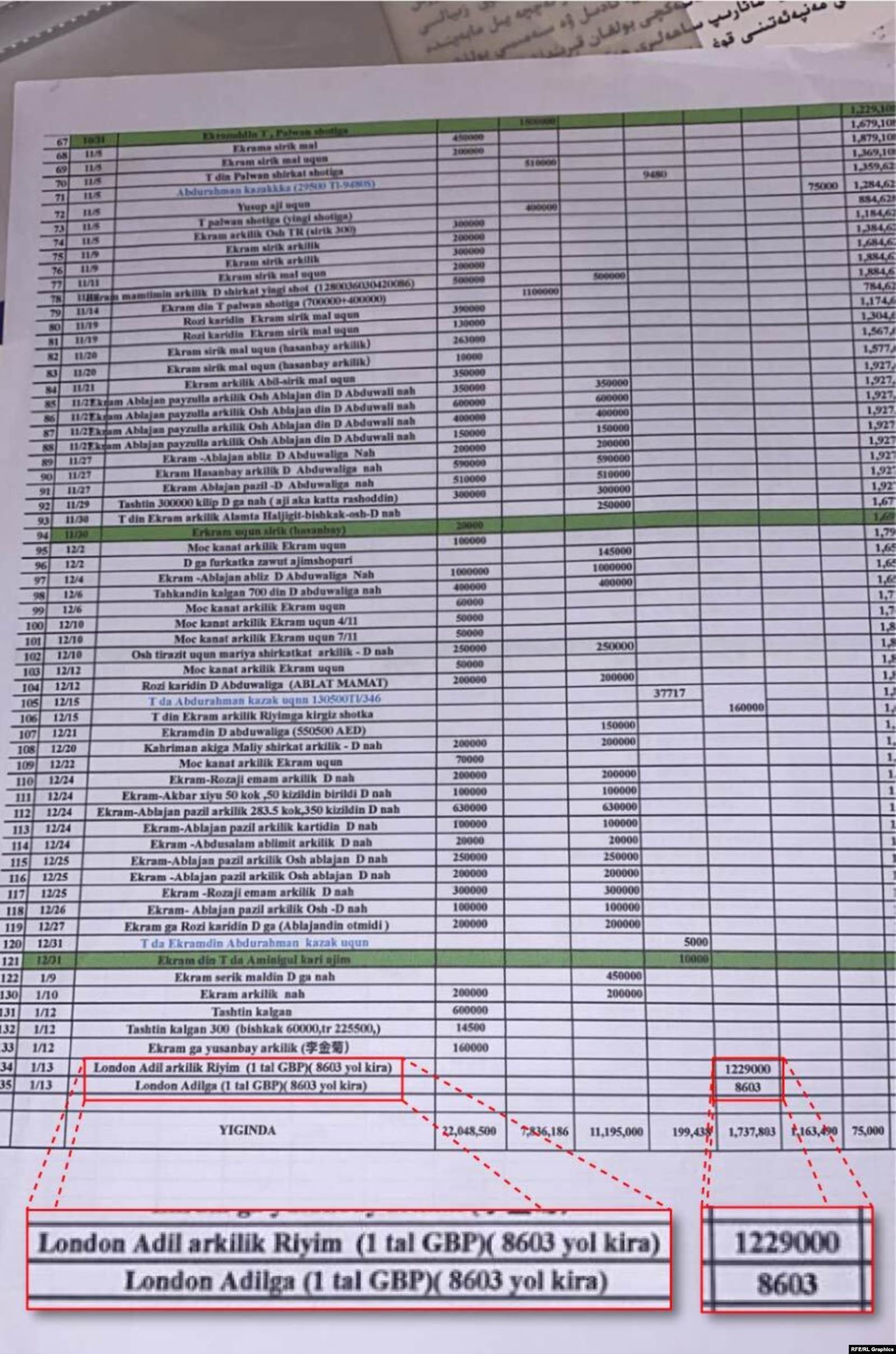 876,105 фунт стерлинг жана 60,000 фунт стерлинг которулганын көрсөткөн документтерде “RK” деп кол менен белгиленген. Саймаити Райымбек Матраимовдун аты-жөнүн ушинтип белгилеп жүргөнүн айтып берген. Ар бир документте “RK” дегендин тушуна “Angilya” деп уйгурча кол менен жазган. Бирок ал жердеги акча мүлккөбү, же башка максаткабы беймаалым калган.